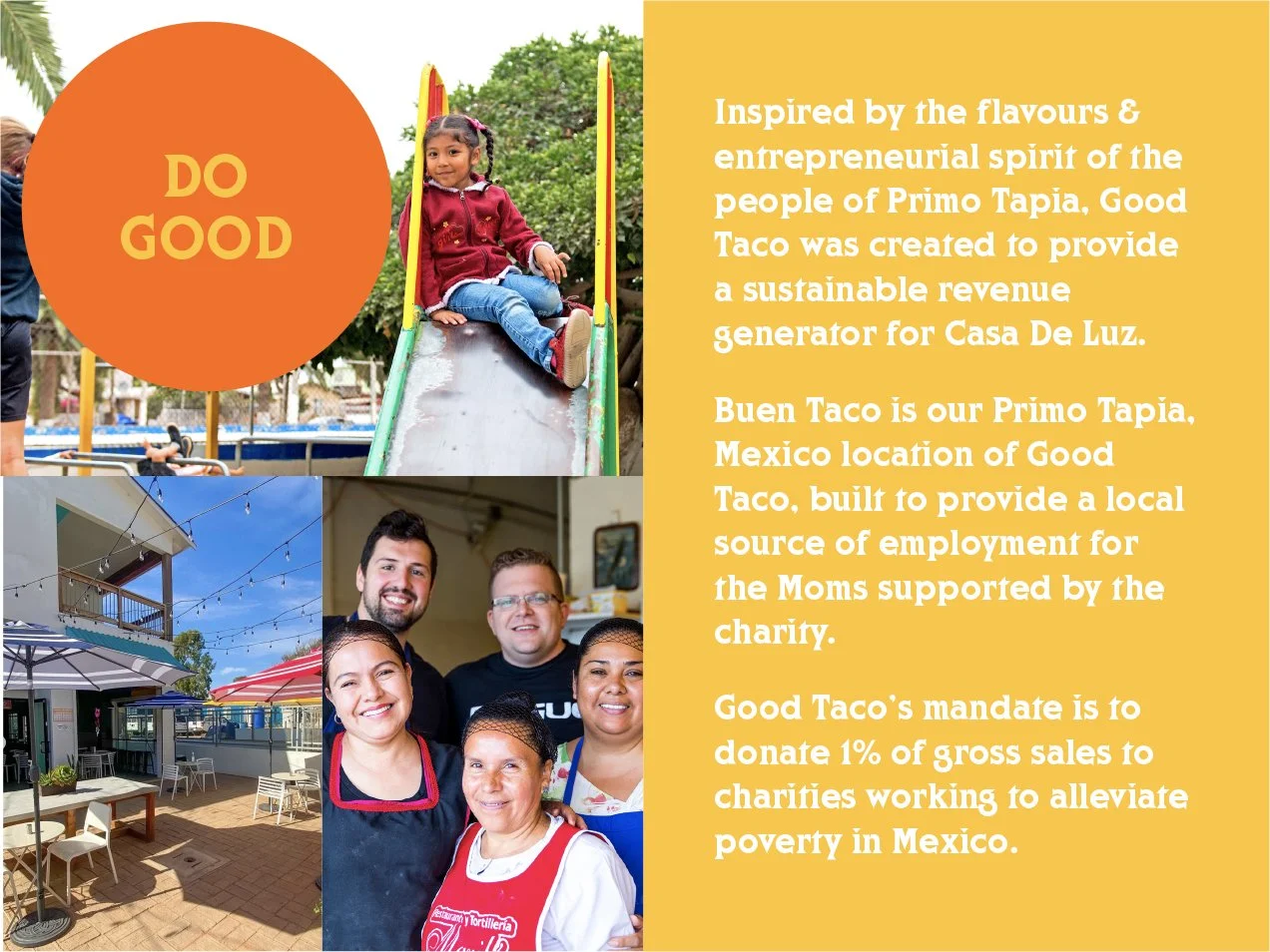 I built the Good Taco brand from the beginning with Founder Dustin May, starting with an inspiration trip to Primo Tapia Mexico in 2018, to meet the mom & kids the brand would be supporting.